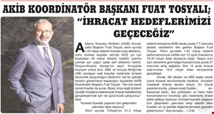 AKİB'in Ekim İhracatı 1,43 Milyar Dolar ANA SAYFAMEDYABASINDA AKİB AKİB’in ekim ihracatı 1,43 milyar dolar.xlsx26,40 KB PAYLAŞ Basında AKİB AHBİB Başkanı Veysel Memiş: Ekimde Yüzde 8 Artışla 195,9 Milyon Dolar İhracat GerçekleştirdikTürk Mobilyasına Fas İlgisiTürkiye, Ekim Ayında Yaş Meyve Sebze İhracatını Yüzde 31 ArtırdıTürk Mobilyacıları ABD'nin Yolunu Tuttu Hedef, Yeni İş Birlikleri ile İhracatı ArtırmakAfrika Pazarı Türk Demir-Çelik Sektörüne Alternatif OlduTürk Mobilyasında Afrika RüzgarıBaşkan Kılıçer: İhracatımızı Artırmak İçin Yeni Pazarlara YoğunlaşıyoruzATHİB Başkanı Fatih Doğan: Devletimizden Acil Destek Bekliyoruz'ATHİB Başkanı Fatih Doğan: Devletimizden Acil Destek BekliyoruzHububat ve Bakliyat İhracatında 2022'nin Yıldızları ÖdüllendirildiTürk İhraç Ürünleri Venezuela Pazarında Vitrine ÇıktıAHBİB Başkanı Veysel Memiş: Ağustos Ayı İhracatımız Yüzde 21 Artışla 211,2 Milyon Dolar