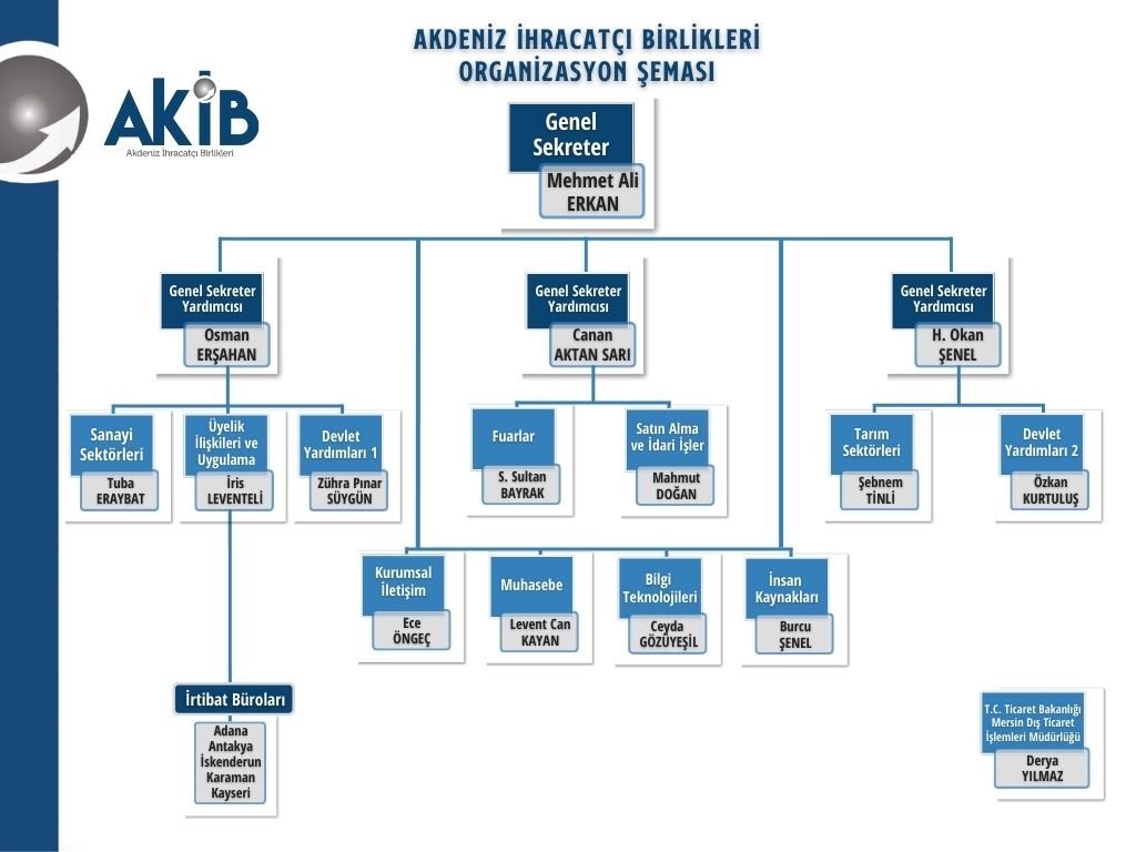 Organizasyon Şeması ANA SAYFAKURUMSAL PAYLAŞ Kurumsal AKİB HakkındaKalite PolitikasıBaşkanlar KuruluGenel SekreterOrganizasyon ŞemasıKanun ve Yönetmeliklerİhracatçı Birliklerinin GörevleriKişisel Verilerin KorunmasıBilgi Güvenliği Politikamız