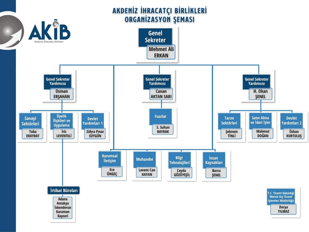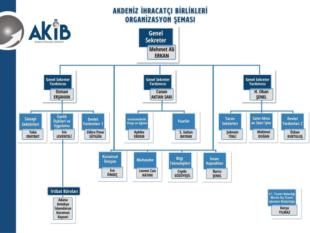 Organizasyon Şeması ANA SAYFAKURUMSAL PAYLAŞ Kurumsal AKİB HakkındaKalite PolitikasıBaşkanlar KuruluGenel SekreterOrganizasyon ŞemasıKanun ve Yönetmeliklerİhracatçı Birliklerinin GörevleriKişisel Verilerin KorunmasıBilgi Güvenliği Politikamız
