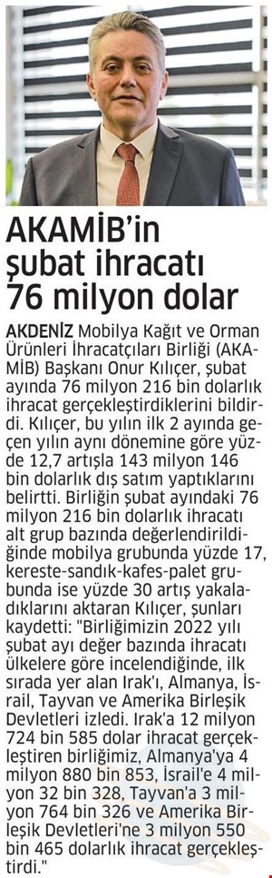 AKAMİB, Şubatta 76 Milyon Dolarlık İhracat Gerçekleştirdi ANA SAYFAMEDYABASINDA AKİB AKAMİB, şubatta 76 milyon dolarlık ihracat gerçekleştirdi.xlsx19,90 KB PAYLAŞ Basında AKİB AHBİB Başkanı Veysel Memiş: Ekimde Yüzde 8 Artışla 195,9 Milyon Dolar İhracat GerçekleştirdikTürk Mobilyasına Fas İlgisiTürkiye, Ekim Ayında Yaş Meyve Sebze İhracatını Yüzde 31 ArtırdıTürk Mobilyacıları ABD'nin Yolunu Tuttu Hedef, Yeni İş Birlikleri ile İhracatı ArtırmakAfrika Pazarı Türk Demir-Çelik Sektörüne Alternatif OlduTürk Mobilyasında Afrika RüzgarıBaşkan Kılıçer: İhracatımızı Artırmak İçin Yeni Pazarlara YoğunlaşıyoruzATHİB Başkanı Fatih Doğan: Devletimizden Acil Destek Bekliyoruz'ATHİB Başkanı Fatih Doğan: Devletimizden Acil Destek BekliyoruzHububat ve Bakliyat İhracatında 2022'nin Yıldızları ÖdüllendirildiTürk İhraç Ürünleri Venezuela Pazarında Vitrine ÇıktıAHBİB Başkanı Veysel Memiş: Ağustos Ayı İhracatımız Yüzde 21 Artışla 211,2 Milyon Dolar