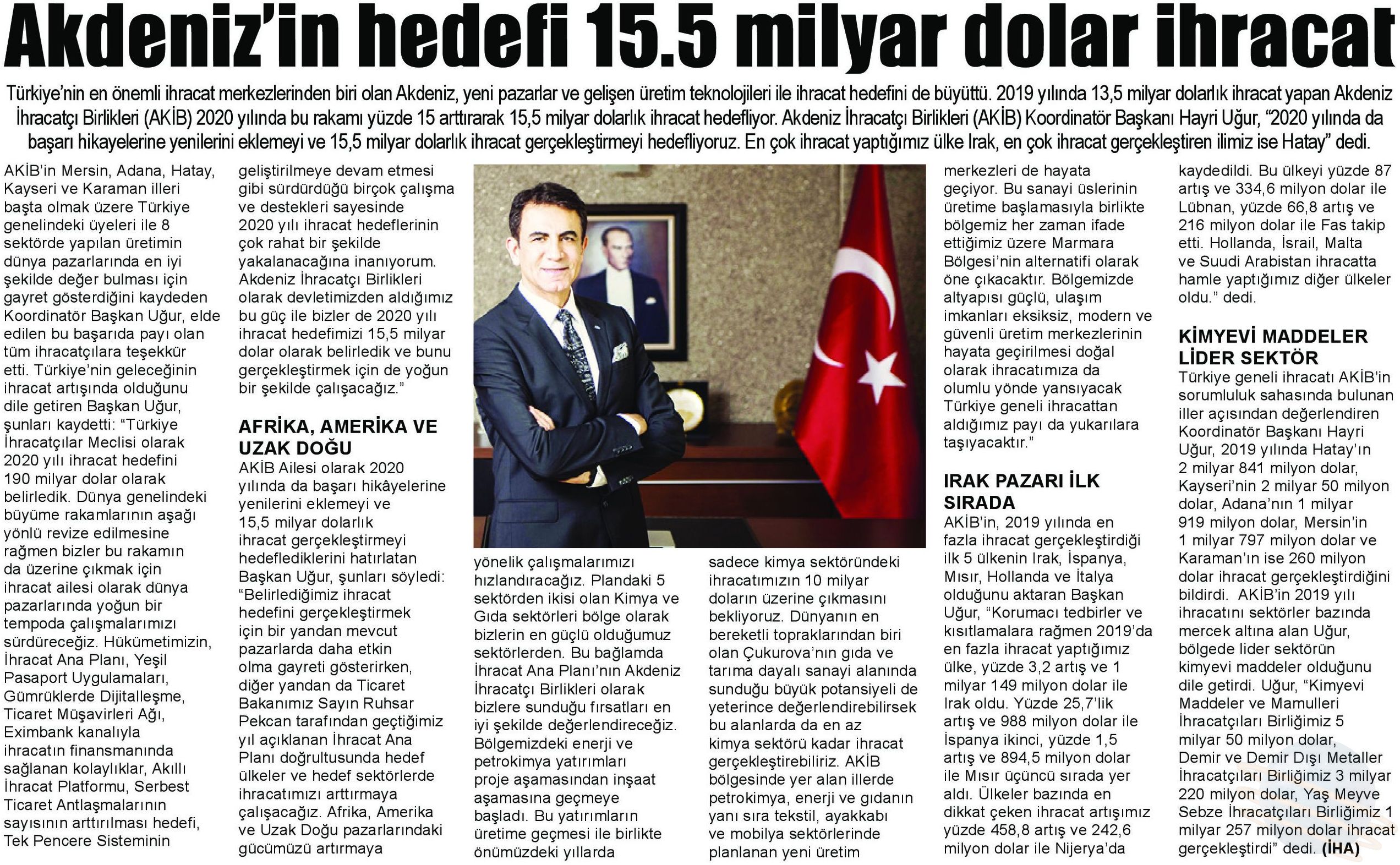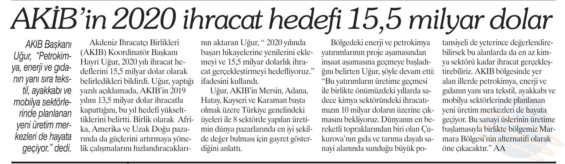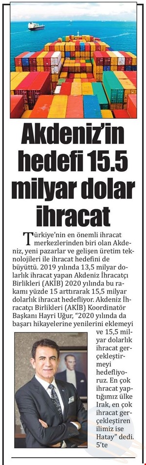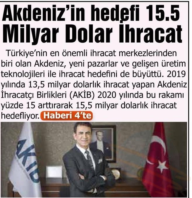 Akdeniz'in hedefi 15,5 milyar dolar - 14 Ocak 2020 ANA SAYFAMEDYABASINDA AKİB Internet Haberleri.xlsx20,30 KB PAYLAŞ Basında AKİB AHBİB Başkanı Veysel Memiş: Ekimde Yüzde 8 Artışla 195,9 Milyon Dolar İhracat GerçekleştirdikTürk Mobilyasına Fas İlgisiTürkiye, Ekim Ayında Yaş Meyve Sebze İhracatını Yüzde 31 ArtırdıTürk Mobilyacıları ABD'nin Yolunu Tuttu Hedef, Yeni İş Birlikleri ile İhracatı ArtırmakAfrika Pazarı Türk Demir-Çelik Sektörüne Alternatif OlduTürk Mobilyasında Afrika RüzgarıBaşkan Kılıçer: İhracatımızı Artırmak İçin Yeni Pazarlara YoğunlaşıyoruzATHİB Başkanı Fatih Doğan: Devletimizden Acil Destek Bekliyoruz'ATHİB Başkanı Fatih Doğan: Devletimizden Acil Destek BekliyoruzHububat ve Bakliyat İhracatında 2022'nin Yıldızları ÖdüllendirildiTürk İhraç Ürünleri Venezuela Pazarında Vitrine ÇıktıAHBİB Başkanı Veysel Memiş: Ağustos Ayı İhracatımız Yüzde 21 Artışla 211,2 Milyon Dolar