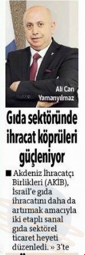 AKİB, gıda sektöründe İsrail ile ihracat köprülerini güçlendiriyor - 15 Ekim 2020 ANA SAYFAMEDYABASINDA AKİB Internet Haberleri.xlsx20,00 KB PAYLAŞ Basında AKİB AHBİB Başkanı Veysel Memiş: Ekimde Yüzde 8 Artışla 195,9 Milyon Dolar İhracat GerçekleştirdikTürk Mobilyasına Fas İlgisiTürkiye, Ekim Ayında Yaş Meyve Sebze İhracatını Yüzde 31 ArtırdıTürk Mobilyacıları ABD'nin Yolunu Tuttu Hedef, Yeni İş Birlikleri ile İhracatı ArtırmakAfrika Pazarı Türk Demir-Çelik Sektörüne Alternatif OlduTürk Mobilyasında Afrika RüzgarıBaşkan Kılıçer: İhracatımızı Artırmak İçin Yeni Pazarlara YoğunlaşıyoruzATHİB Başkanı Fatih Doğan: Devletimizden Acil Destek Bekliyoruz'ATHİB Başkanı Fatih Doğan: Devletimizden Acil Destek BekliyoruzHububat ve Bakliyat İhracatında 2022'nin Yıldızları ÖdüllendirildiTürk İhraç Ürünleri Venezuela Pazarında Vitrine ÇıktıAHBİB Başkanı Veysel Memiş: Ağustos Ayı İhracatımız Yüzde 21 Artışla 211,2 Milyon Dolar