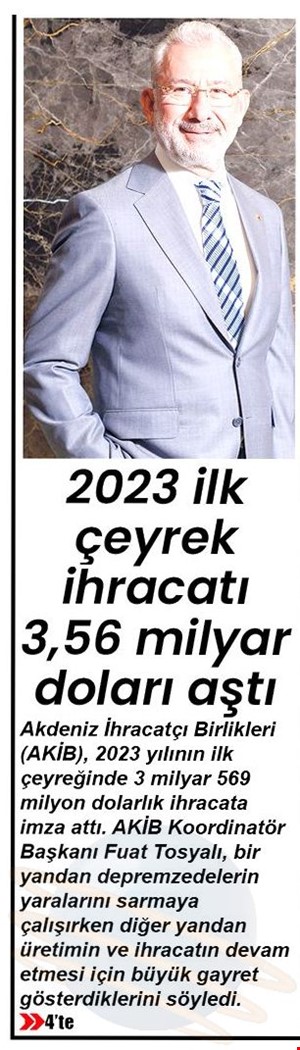 AKİB'in 2023 İlk Çeyrek İhracatı 3,56 Milyar Doları Aştı ANA SAYFAMEDYABASINDA AKİB AKİB’in 2023 ilk çeyrek ihracatı 3,56 milyar doları aştı.xlsx26,60 KB PAYLAŞ Basında AKİB AHBİB Başkanı Veysel Memiş: Ekimde Yüzde 8 Artışla 195,9 Milyon Dolar İhracat GerçekleştirdikTürk Mobilyasına Fas İlgisiTürkiye, Ekim Ayında Yaş Meyve Sebze İhracatını Yüzde 31 ArtırdıTürk Mobilyacıları ABD'nin Yolunu Tuttu Hedef, Yeni İş Birlikleri ile İhracatı ArtırmakAfrika Pazarı Türk Demir-Çelik Sektörüne Alternatif OlduTürk Mobilyasında Afrika RüzgarıBaşkan Kılıçer: İhracatımızı Artırmak İçin Yeni Pazarlara YoğunlaşıyoruzATHİB Başkanı Fatih Doğan: Devletimizden Acil Destek Bekliyoruz'ATHİB Başkanı Fatih Doğan: Devletimizden Acil Destek BekliyoruzHububat ve Bakliyat İhracatında 2022'nin Yıldızları ÖdüllendirildiTürk İhraç Ürünleri Venezuela Pazarında Vitrine ÇıktıAHBİB Başkanı Veysel Memiş: Ağustos Ayı İhracatımız Yüzde 21 Artışla 211,2 Milyon Dolar