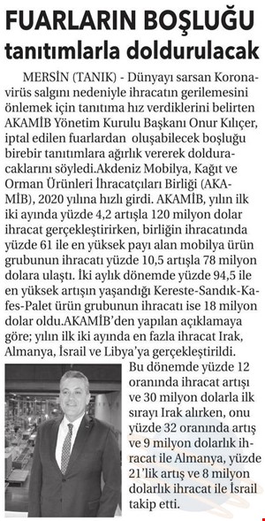Fuarlar iptal birebir tanıtımlara yoğunlaştık - 13 Mart 2020 ANA SAYFAMEDYABASINDA AKİB Internet Haberleri.xlsx12,50 KB PAYLAŞ Basında AKİB AHBİB Başkanı Veysel Memiş: Ekimde Yüzde 8 Artışla 195,9 Milyon Dolar İhracat GerçekleştirdikTürk Mobilyasına Fas İlgisiTürkiye, Ekim Ayında Yaş Meyve Sebze İhracatını Yüzde 31 ArtırdıTürk Mobilyacıları ABD'nin Yolunu Tuttu Hedef, Yeni İş Birlikleri ile İhracatı ArtırmakAfrika Pazarı Türk Demir-Çelik Sektörüne Alternatif OlduTürk Mobilyasında Afrika RüzgarıBaşkan Kılıçer: İhracatımızı Artırmak İçin Yeni Pazarlara YoğunlaşıyoruzATHİB Başkanı Fatih Doğan: Devletimizden Acil Destek Bekliyoruz'ATHİB Başkanı Fatih Doğan: Devletimizden Acil Destek BekliyoruzHububat ve Bakliyat İhracatında 2022'nin Yıldızları ÖdüllendirildiTürk İhraç Ürünleri Venezuela Pazarında Vitrine ÇıktıAHBİB Başkanı Veysel Memiş: Ağustos Ayı İhracatımız Yüzde 21 Artışla 211,2 Milyon Dolar