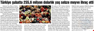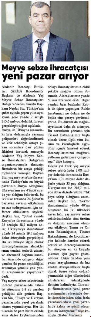 Yaş Meyve Sebze İhracatı Şubat Ayında 255 Milyon Doları Aştı ANA SAYFAMEDYABASINDA AKİB Yaş meyve sebze ihracatı şubat ayında 255 milyon doları aştı.xlsx42,60 KB PAYLAŞ Basında AKİB AHBİB Başkanı Veysel Memiş: Ekimde Yüzde 8 Artışla 195,9 Milyon Dolar İhracat GerçekleştirdikTürk Mobilyasına Fas İlgisiTürkiye, Ekim Ayında Yaş Meyve Sebze İhracatını Yüzde 31 ArtırdıTürk Mobilyacıları ABD'nin Yolunu Tuttu Hedef, Yeni İş Birlikleri ile İhracatı ArtırmakAfrika Pazarı Türk Demir-Çelik Sektörüne Alternatif OlduTürk Mobilyasında Afrika RüzgarıBaşkan Kılıçer: İhracatımızı Artırmak İçin Yeni Pazarlara YoğunlaşıyoruzATHİB Başkanı Fatih Doğan: Devletimizden Acil Destek Bekliyoruz'ATHİB Başkanı Fatih Doğan: Devletimizden Acil Destek BekliyoruzHububat ve Bakliyat İhracatında 2022'nin Yıldızları ÖdüllendirildiTürk İhraç Ürünleri Venezuela Pazarında Vitrine ÇıktıAHBİB Başkanı Veysel Memiş: Ağustos Ayı İhracatımız Yüzde 21 Artışla 211,2 Milyon Dolar